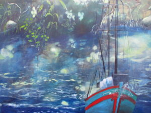 Une contemplation, un moment plus qu’un instant, huile sur toile, 83x130cmUn éclat, trois petits poissons en bas à gauche, huile sur toile, 65x100cmRegarder la splendeur du jour et être heureux, mon cher petite ange, huile sur toile, 138x86cm