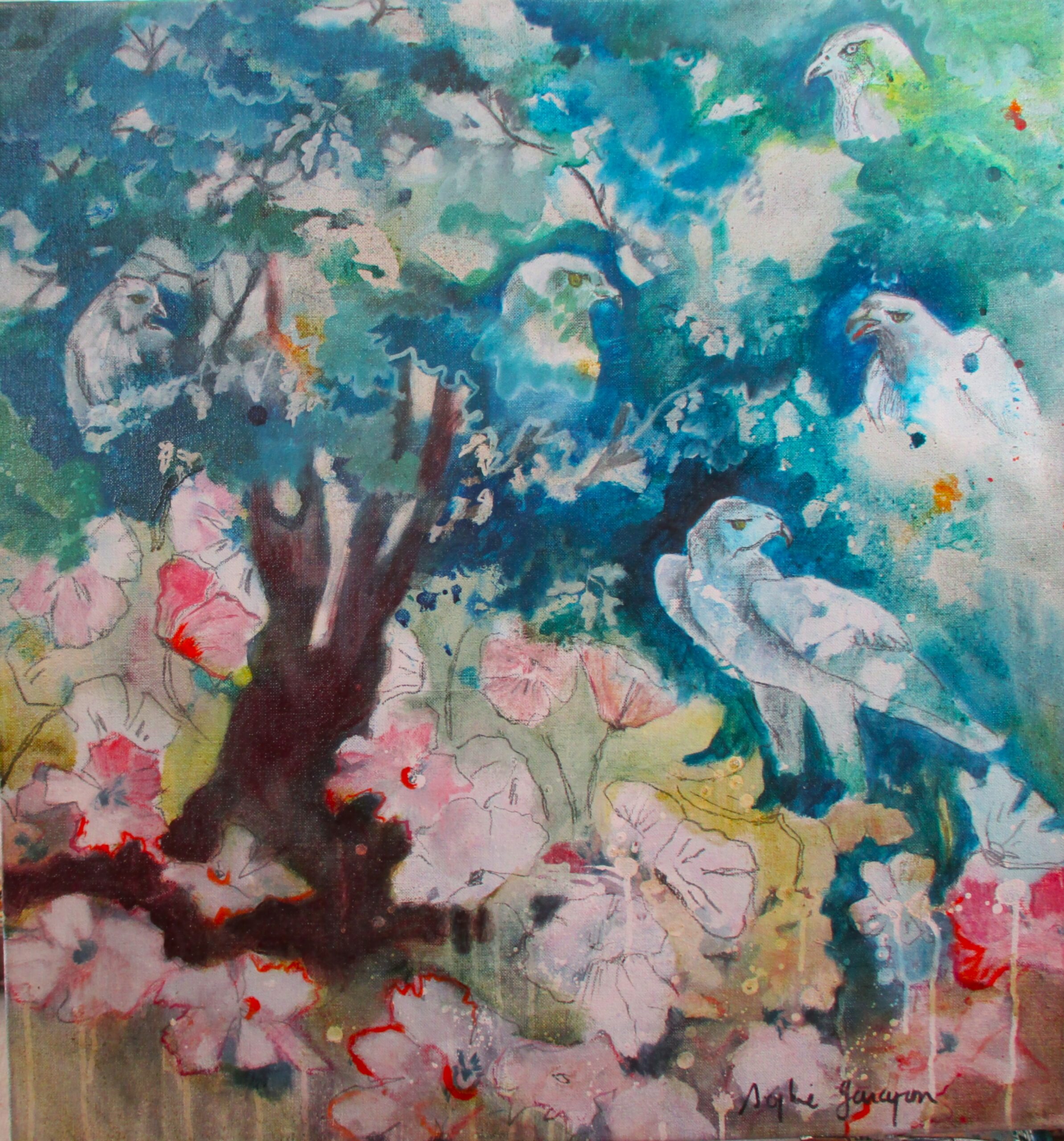 Huile sur toile 20×20  hé! toi l’oiseau!